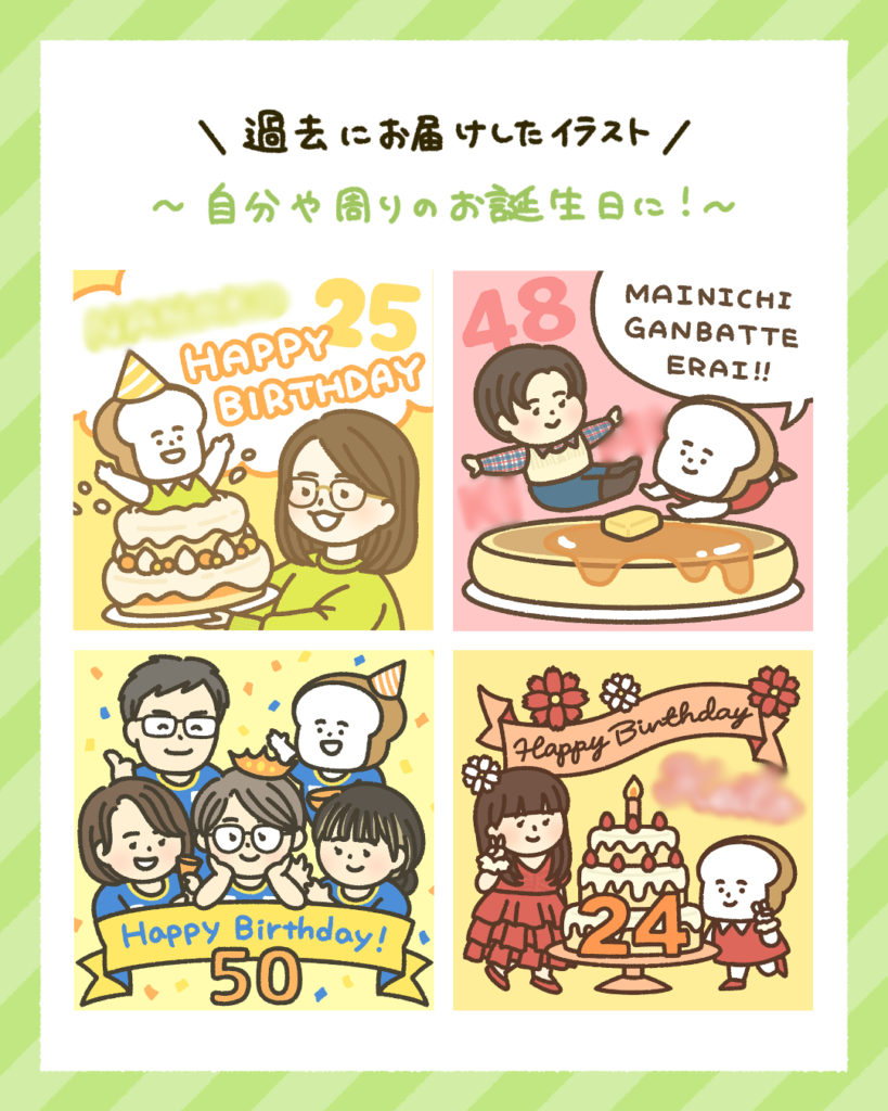 今回の販売は第4弾で、「まいにちパン子」のキャラクターとご依頼者さまの似顔絵を描かせていただく企画となっております。